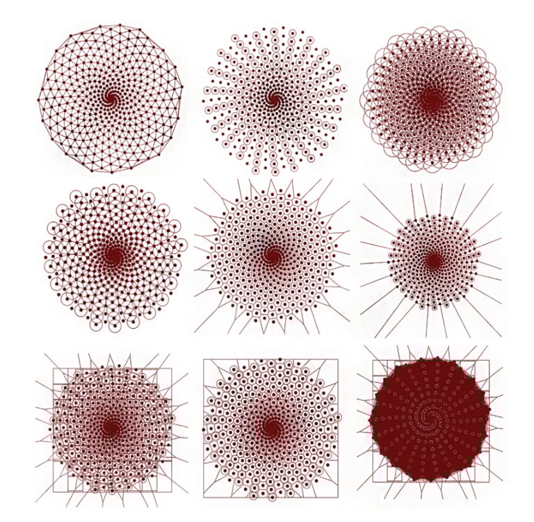Fig: Parametric Generative designs Phyllotaxis by using two simple pattern algorithms that are inspired by nature; Voronoi diagram-based algorithm and the Fibonacci sequence algorithm. (Visual algorithmic programs; Rhinoceros/Grasshopper). Source: Naturally Generative Algorithmic Designs by Nessreen Y. Ibrahim (Author).